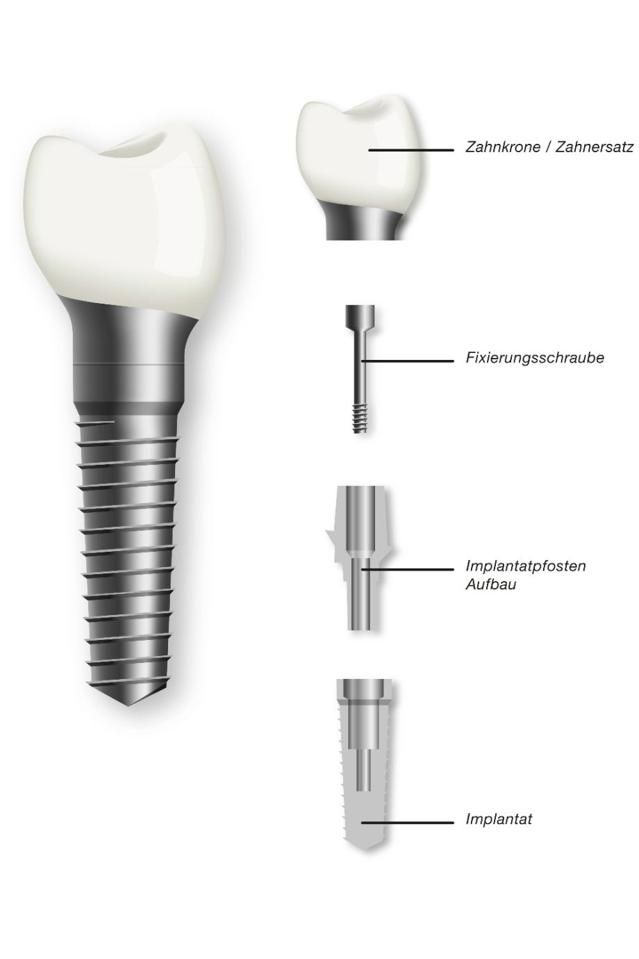 Dentalimplantate sind künstliche Zahnwurzeln, meist aus Titan, die in den Kieferknochen eingesetzt werden, um verlorene Zähne zu ersetzen. Einmal im Kiefer verankert, dienen sie als Basis für Kronen, Brücken oder Prothesen, wodurch sowohl die Funktion als auch das ästhetische Erscheinungsbild des Mundes wiederhergestellt werden. Sie bieten eine dauerhafte und zuverlässige Lösung für den Zahnersatz und fühlen sich oft wie natürliche Zähne an.